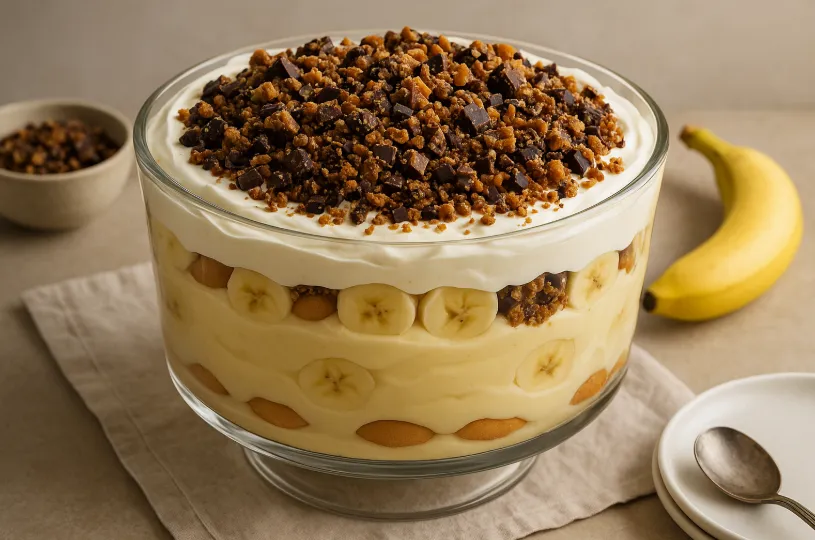 Now we take that same comfort dessert and give it a little “Mama’s Toffee” glow-up. The silky vanilla pudding, fresh bananas, and classic cookies are still there—but on top, you get a generous shower of crunchy, chocolatey Mama’s Toffee crumbles. The contrast of cool pudding, soft banana, and crisp, buttery toffee is one of those bites you close your eyes for.